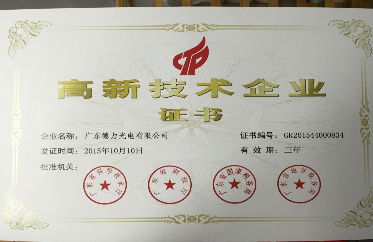 2016年3月25日德力光電收到廣東省科學技術廳、廣東省財政廳、廣東省國家稅務局、廣東省地方稅務局聯合頒發的《高新技術企業證書》。這是對德力光電科研成果及技術創新的認可,是企業科技實力及持續創新能力的證明。